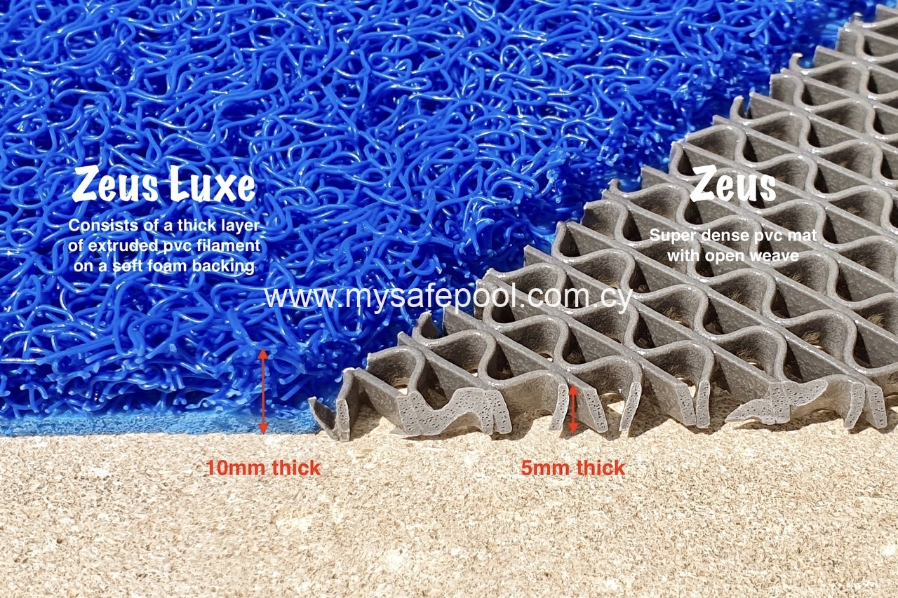 КАК ЭТИ ПРОДУКТЫ РАБОТАЮТ? ‘Зевс’ коврик, предотвращающий поскальзывание, сделан из супер-плотного пвх, его шероховатая поверхность шириной 5 мм обеспечивает безопасное и комфортное сцепление под ногами. Открытые переплетения позволяют воде просачиваться сквозь него, не задерживаясь. “Зевс Люкс“ шириной 10 мм имеет более мягкую роскошную текстуру, которую вы ощущаете под ногами. Оба продукта помогают избежать случаев падения/поскальзывания в таких опасных местах как бассейны, комнаты для переодевания, ванные, бары и кухни.