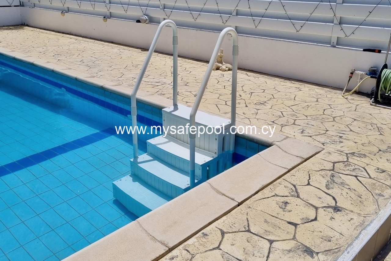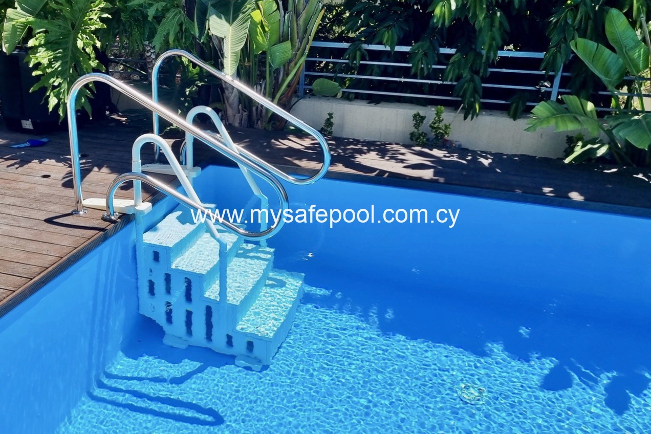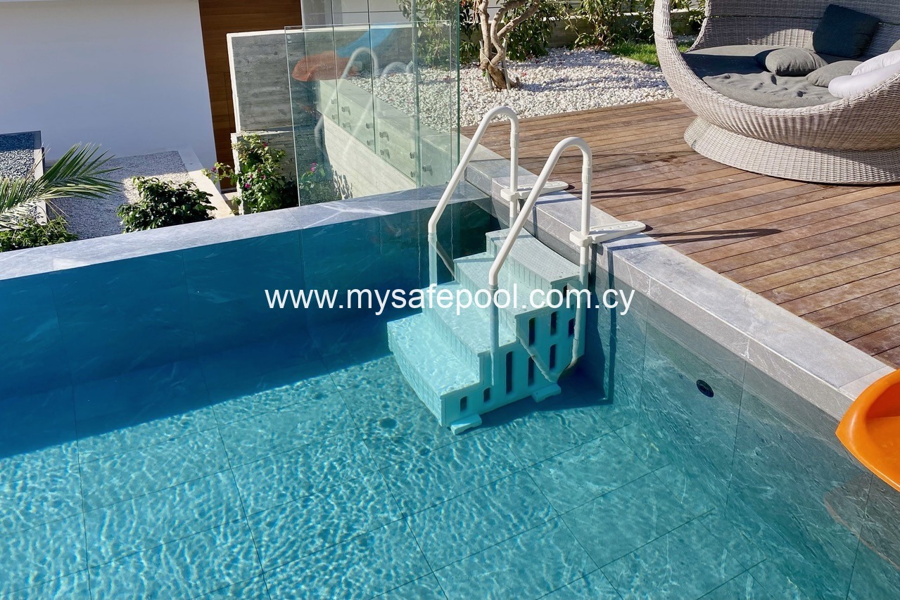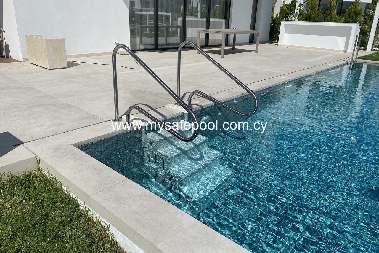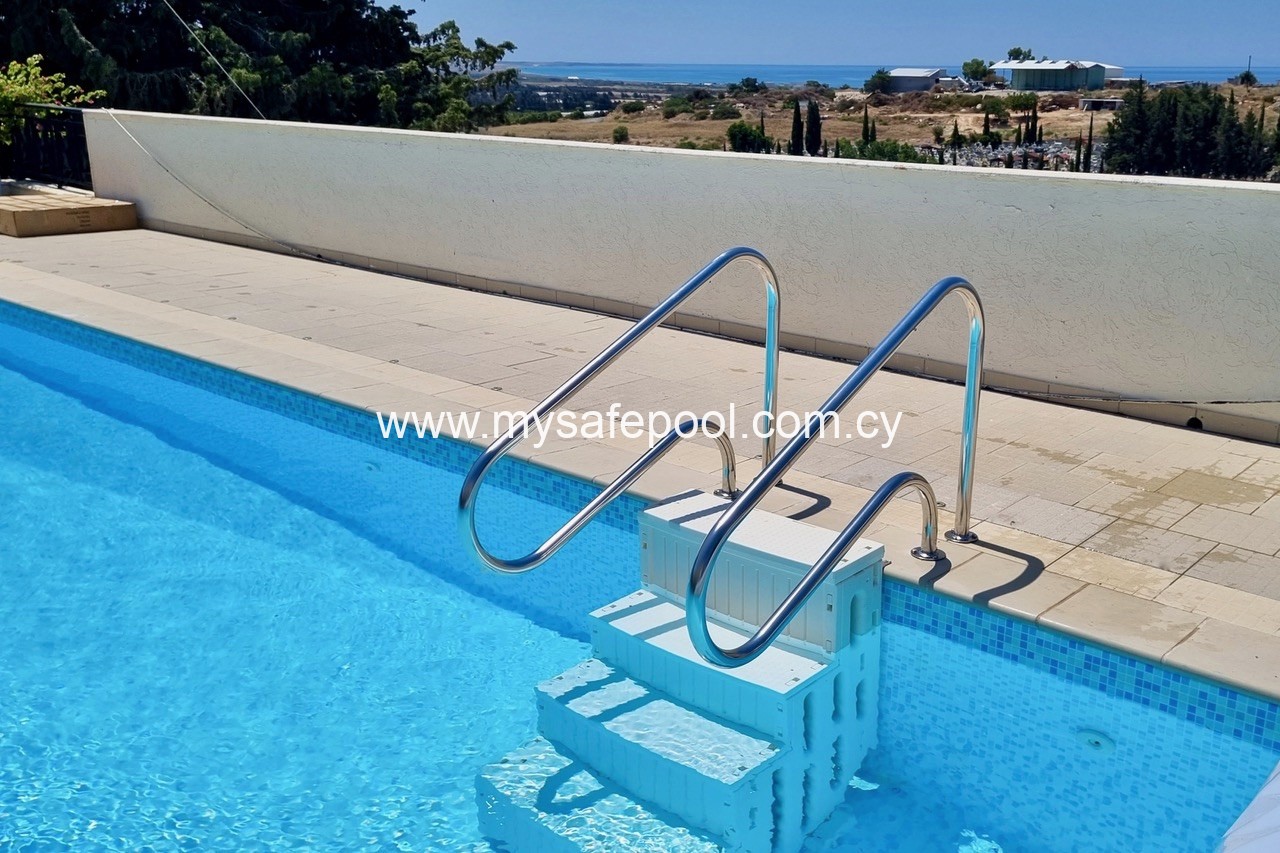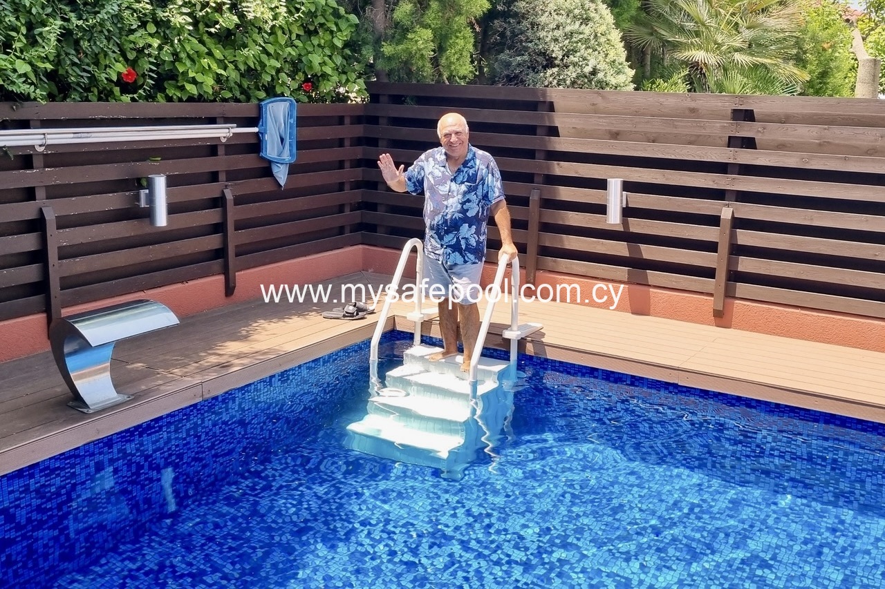 Marina suffered from multiple hip dislocations and lost a lot of leg power making impossible climbing a normal pool ladder. Safe.T.First found the best possible solution within multiple first quality products: four steps to top level of the pool with strong stainless grab rails. In addition, Alan the technician, made a perfect and clean installation using the precision of a watchmaker. We are very thankful to Safe.T.Pool and can strongly recommend the company as a competent and faithful partner.