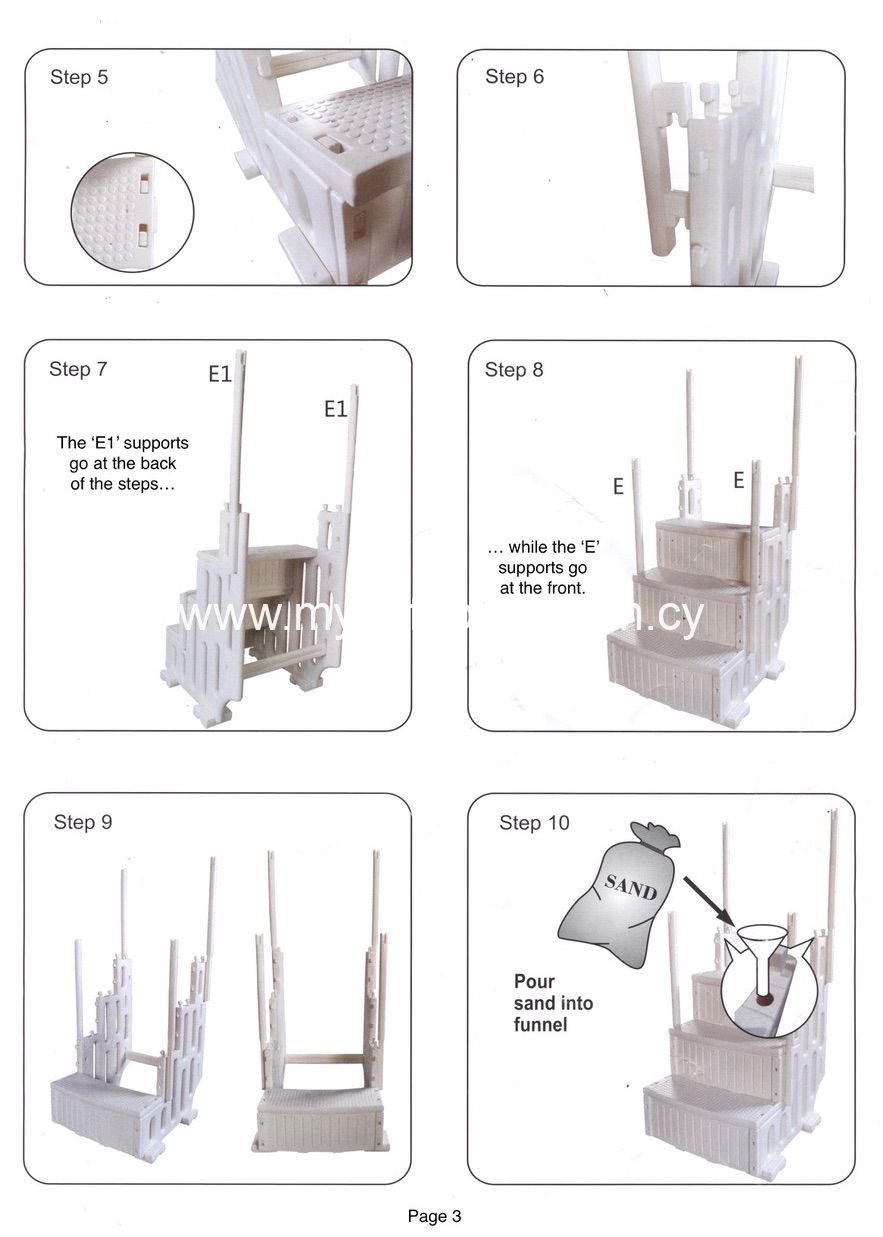 ВАЖНАЯ ИНФОРМАЦИЯ: Время сборки 20-30 минут. Время установки (2 человека) 40 минут. Необходимые инструменты: резиновый или пластиковый молоток, сверло, волоконно/пластиковые вставки (н-р, винтовой анкер), длинные из нержавеющей стали или оцинкованные винты и воронка среднего размера. Плюс, 25 кг песка для фильтра для бассейна (строительный песок не подходит). Ступени можно установить в любой точке неглубокой стороны бассейна про условии, что дно там ровное. Внимательно следить, чтобы не загораживать скиммеры, впускные форсунки и освещение.