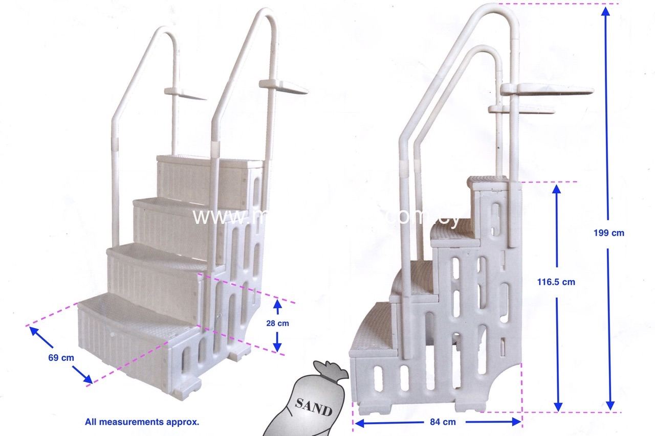 • Ступени весят 23 кг, но требуется дополнительный балласт из песка, который засыпается в верхнюю часть рамы через воронку. Мы поставляем специальный песок, либо же Вы можете купить его сами в любом специализированном магазине бассейнов.