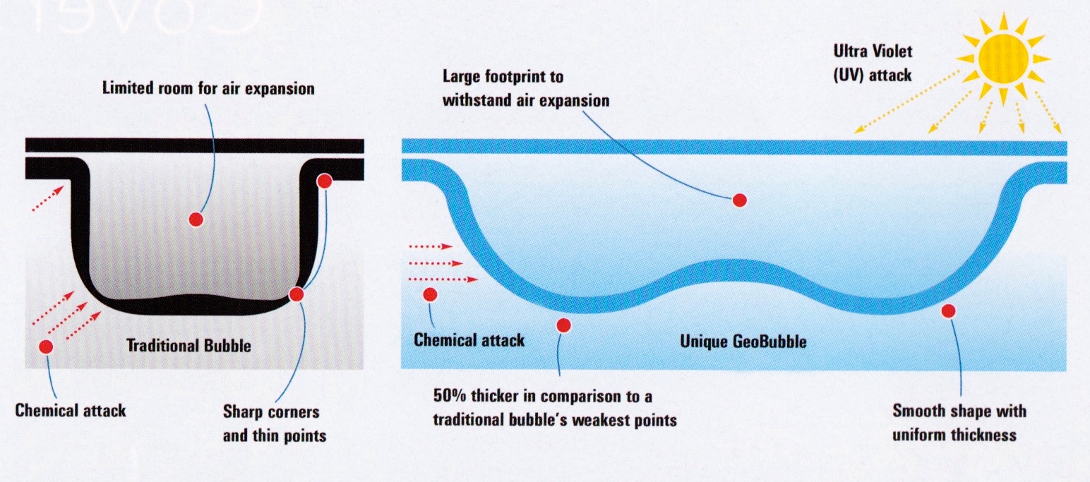 ЧТО ОТЛИЧАЕТ НАШИ СОЛНЕЧНЫЕ ПОКРЫВАЛА? ‘Арести’ и ‘Артура’ — покрывала с дизайном нового третьего поколения, в которых воздушные пузырьки представлены в виде фасолины/почки. Подобная форма позволяет им расширяться, когда воздух внутри них нагревается. Этот материал также более толстый – на 50% больше, чем стандартные пузырьки. Этот продукт обеспечивает бассейну исключительный нагрев и изоляционные свойства, наряду с замечательной устойчивостью к УФ и химическим веществам. Совокупность всех этих качеств в значительной степени продлевает срок службы продукта.