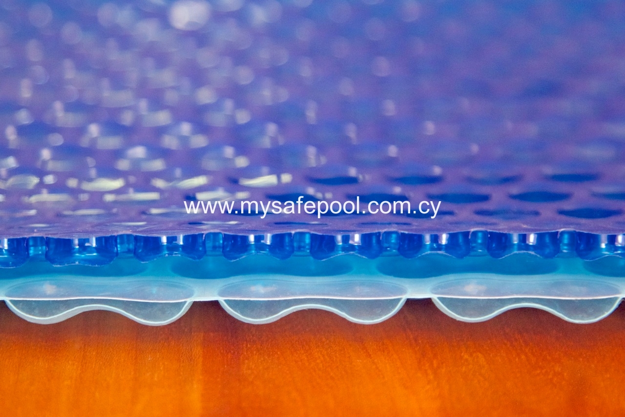 Солнечное покрывало – это легкое термическое ‘одеяло’, которое свободно лежит на бассейне. Сделанное из полупрозрачного пластикового материала, покрывало имеет внутреннюю прослойку со специально сформированными пузырьками воздуха, которые поглощают солнечные лучи; таким образом вода в бассейне нагревается на 4-8°C. В ночное время, когда становится прохладнее, пузырьки выступают в роли изоляционного слоя и минимизируют потерю тепла воды в бассейне.