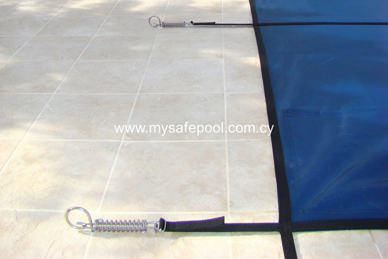 - Подпружиненные натяжные анкеры из нержавеющей стали прочно крепятся на расстоянии 120 – 150 см друг от друга. Ремень, продетый сквозь каждый анкер может быть натянут, обеспечивая тем самым необходимое натяжение покрывала.