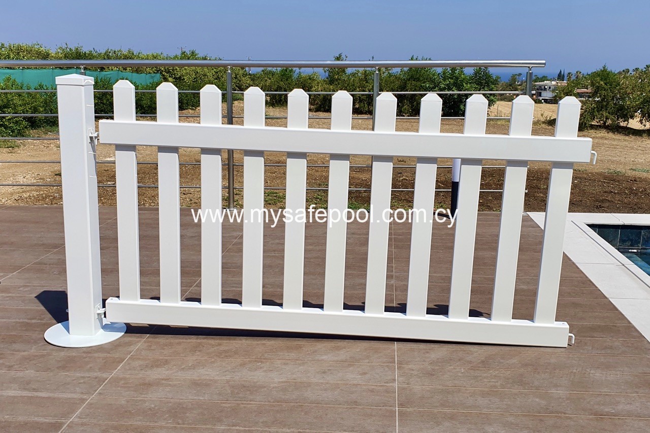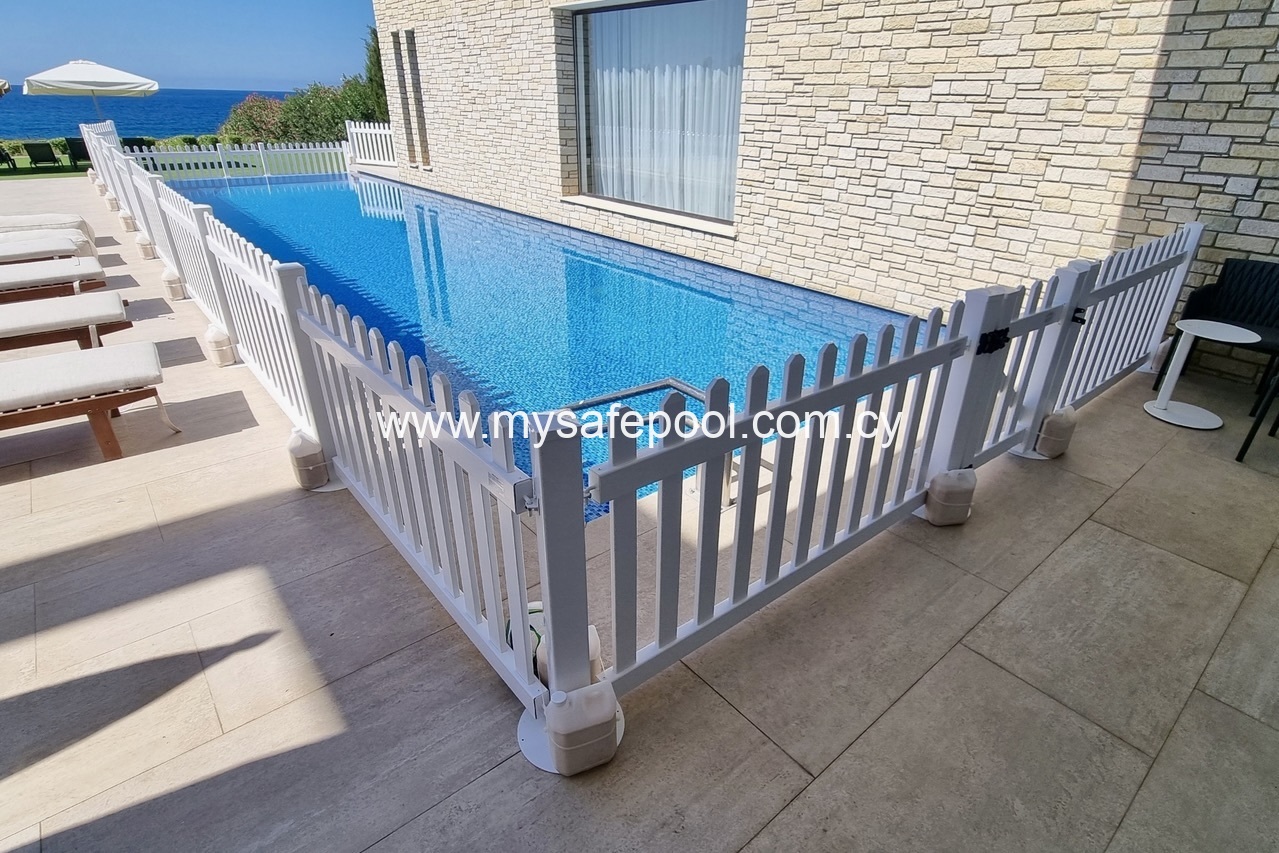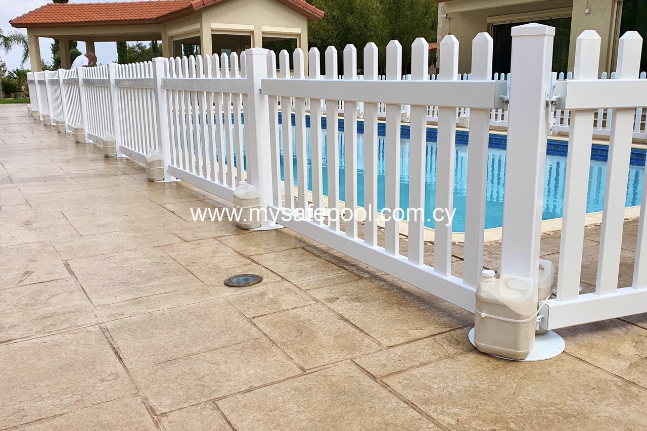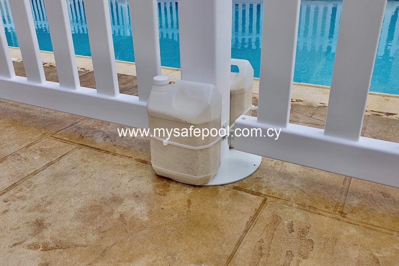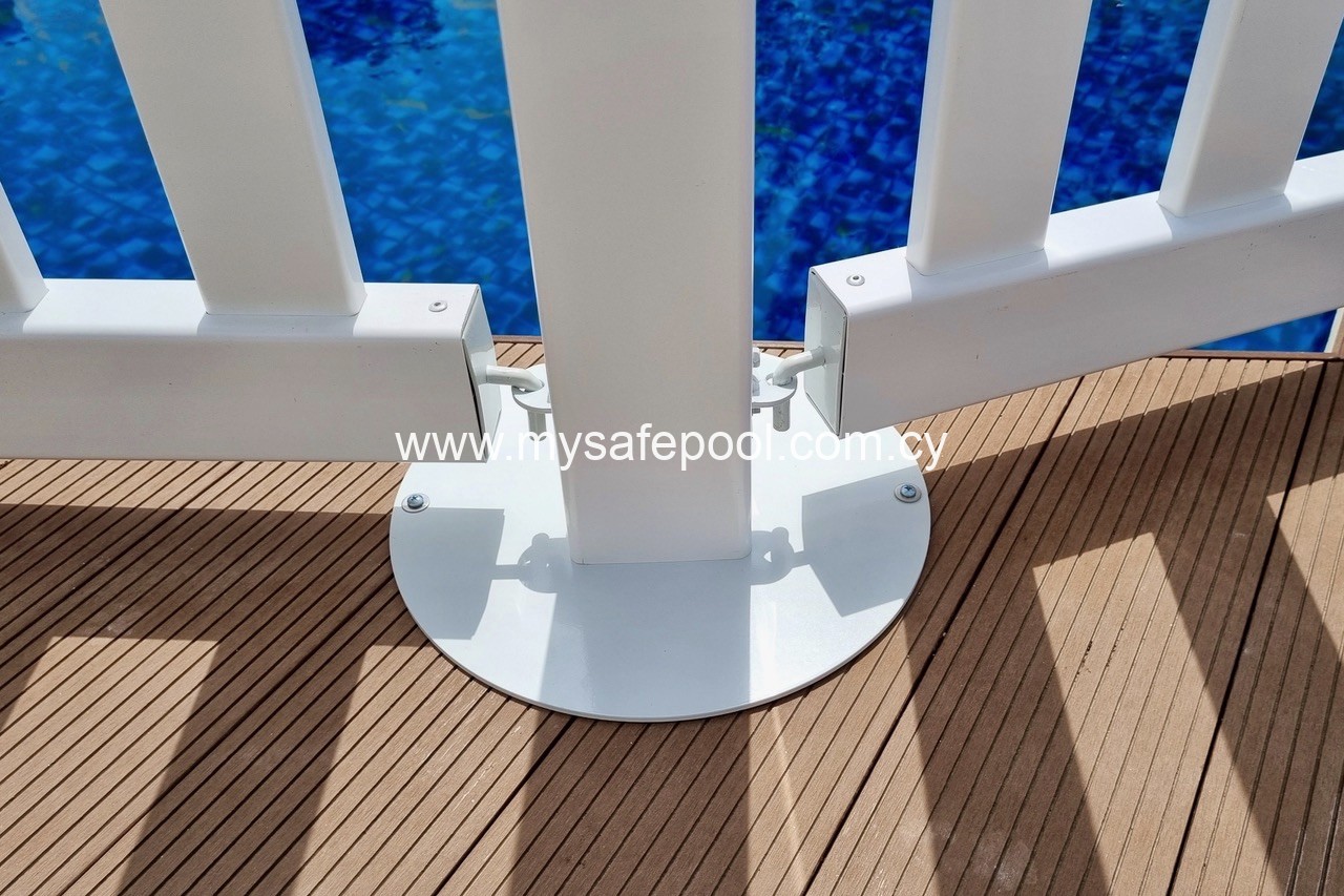Ограждение с Нулевыми Отверстиями Зорба – это съемное, безопорное ограждение в виде штакетника модульной конструкции, в которое можно вставить калитку. Ограждение Зорба прикрепляется к фланцевым стойкам с тяжелыми круглыми основаниями, и поэтому его можно установить, не сверля отверстия в площадке у бассейна. Это делает его подходящим для: